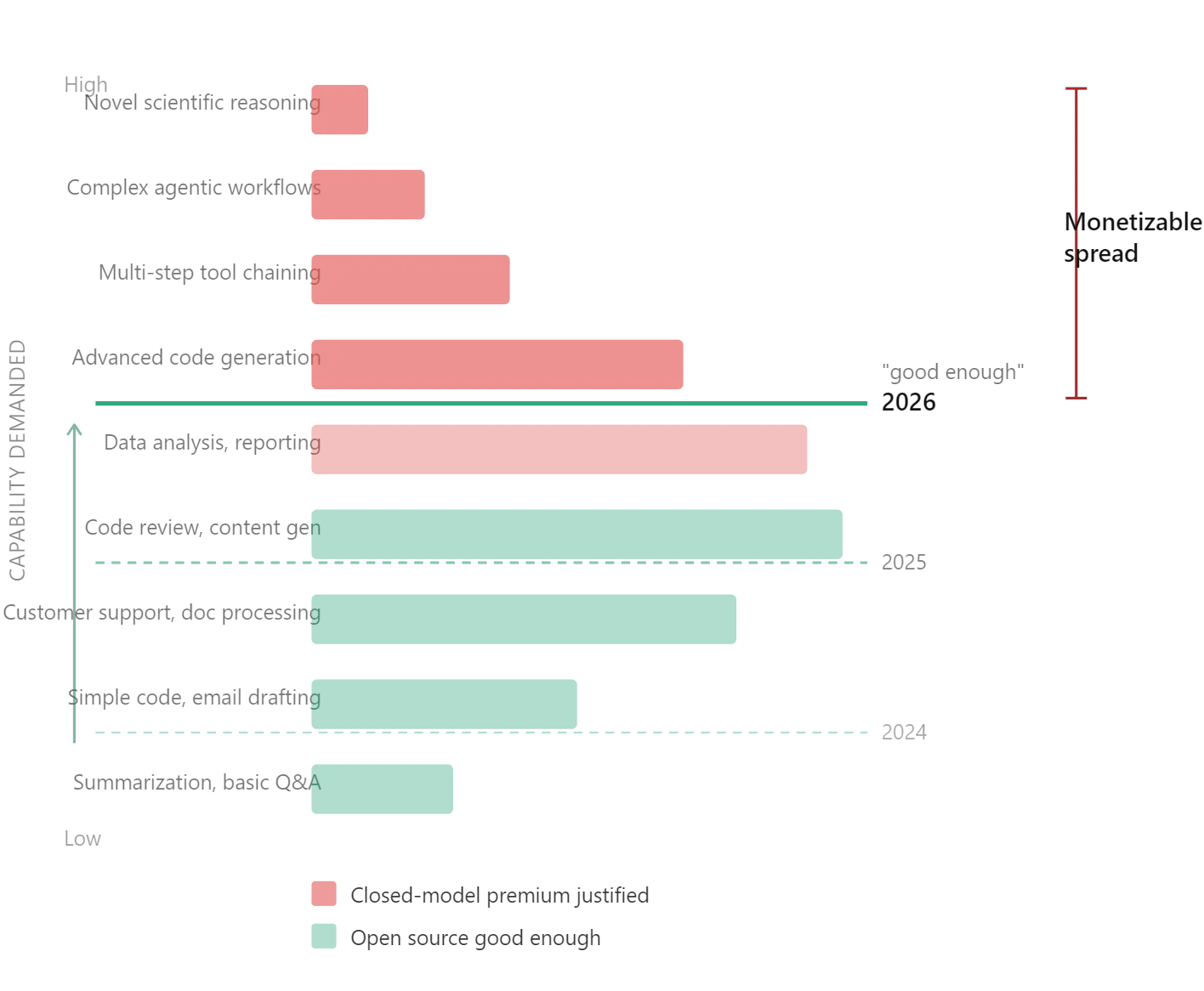Friedman argues that the number that actually matters for frontier lab valuations is not the capability gap between closed and open models. It is the "monetizable spread": the subset of that gap that customers will actually pay a premium for. His central claim is that the monetizable spread is shrinking faster than the capability gap. If that is true, frontier labs are closer to utilities than platforms, and their current equity valuations reflect a moat that is quietly disappearing.