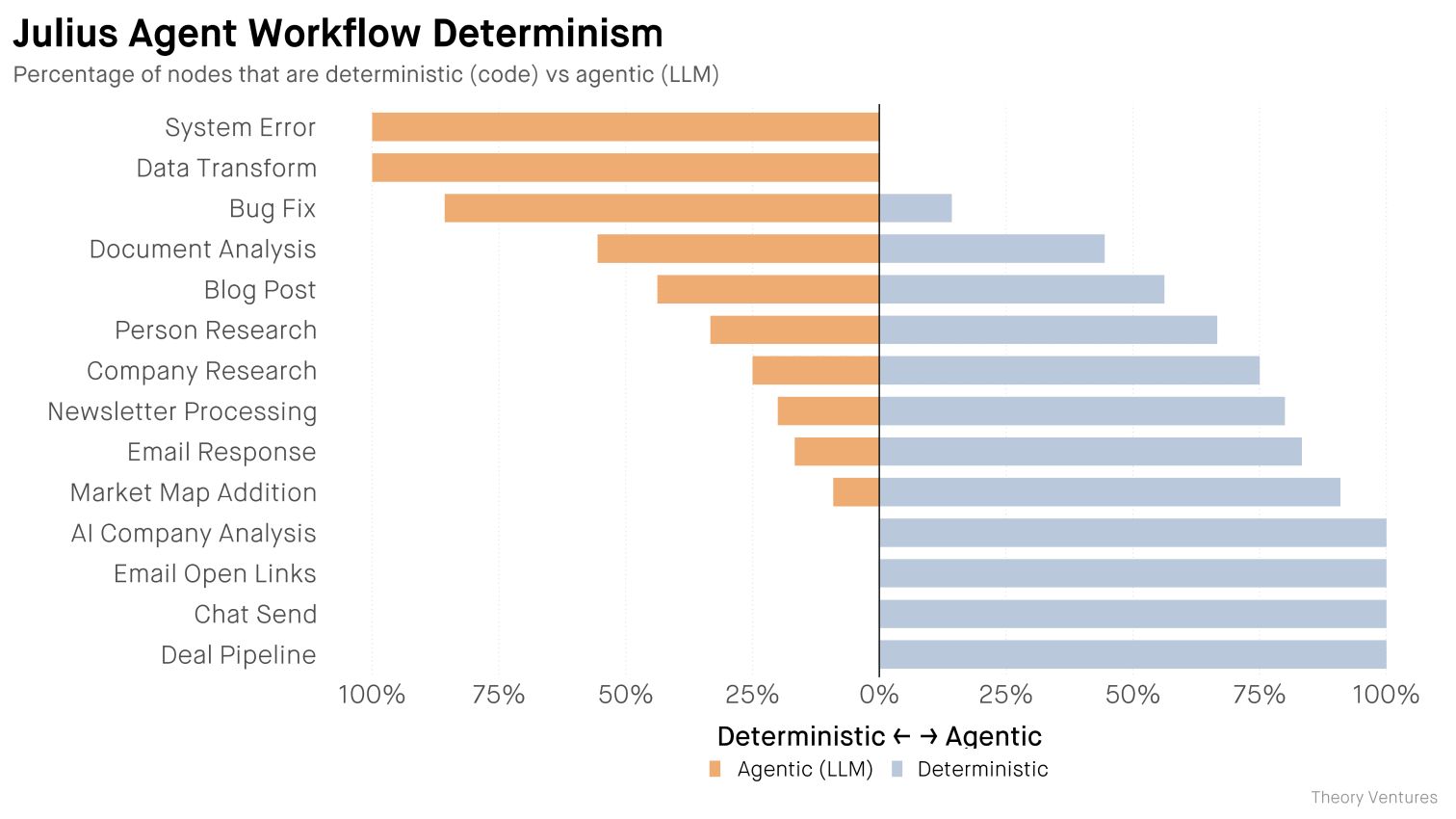 Tomasz Tunguz, Theory Ventures after 6 months of building real agents, a VC shares what actually works: 65% of his workflow nodes now run as deterministic code, not LLM calls.