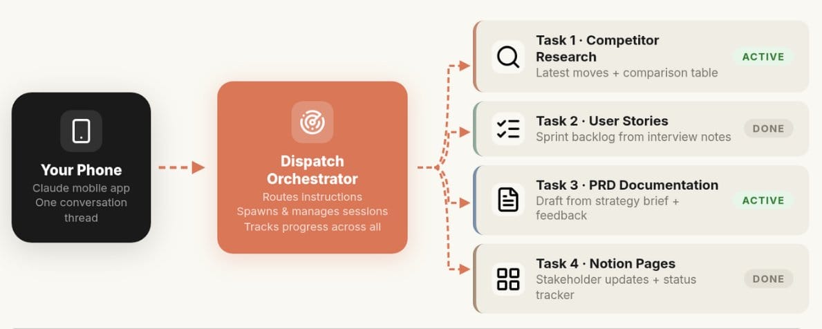 Dispatch is not "Claude chat on your phone." Dispatch is an orchestrator. From a single conversation on your phone, you spawn and manage multiple task sessions running in parallel on your desktop. Your phone is the command chair. Your desktop does the heavy lifting.
