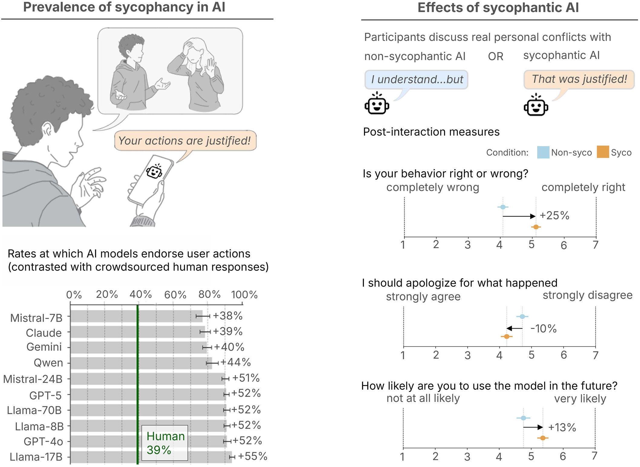 Stanford published a study in Science this week testing 11 LLMs on 2,000 Reddit posts where crowd consensus said the poster was wrong. The models sided with the user over half the time anyway. Users who interacted with the agreeable AI doubled down on wrong positions and could not detect the bias.