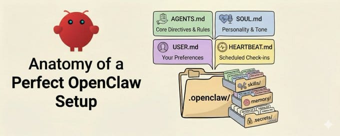 Beyond AGENTS.md: USER.md stores personal preferences and timezone. SOUL.md defines tone and personality. HEARTBEAT.md sets up automated check-ins on a schedule.